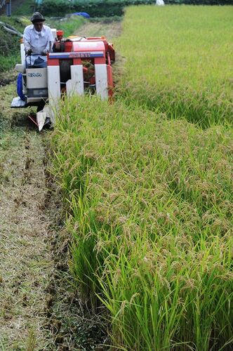 秋を求めて、山里へ。 以前行った松山近郊の棚田に向かう。 天気は雨時々曇り。 山に近づくほど、雨が激しくなる。 雨の棚田もいいかもと思いながら、到着すると、そこは秋一色。 半数くらいの田圃は稲刈りが終わっている。 来るのが遅すぎたようである。 稲…