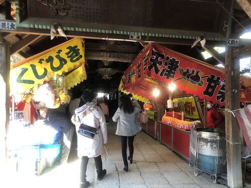 正月も三日。 人出も減っただろうと、初詣へ。 それでも、まだ人が多く・・ 本堂の前には行列が。 さらに、やきもちの店の前はもっと長く・・ 買えるまで、20分待ち。 観光客も戻ってきました。