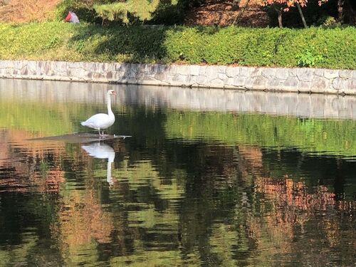 園内の紅葉もそろそろ終わりに・・ 葉もかなり落ちてきました。 お堀の中にもたくさんの落ち葉が・・ 係の人が毎日忙しく掃除をしています。 そのお堀の中も水鏡が美しく・・ 通るたびに楽しませてもらっています。