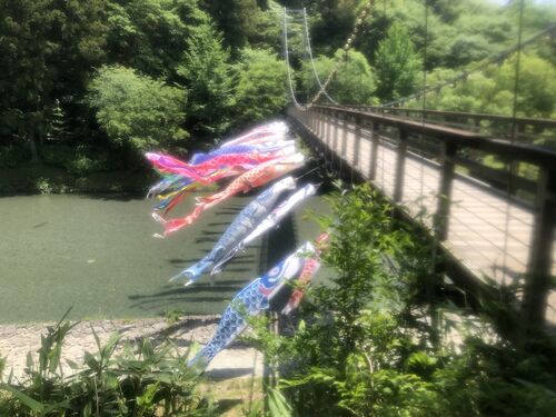 五月晴れの暖かい日差しに誘われて、内子へ。 道の駅、からりによってみました。 5月なので、鯉のぼりが気持ちよく川の上を・・ 川の上を涼しい風が吹き抜けていました。 そして、お約束の「もち麦うどん」